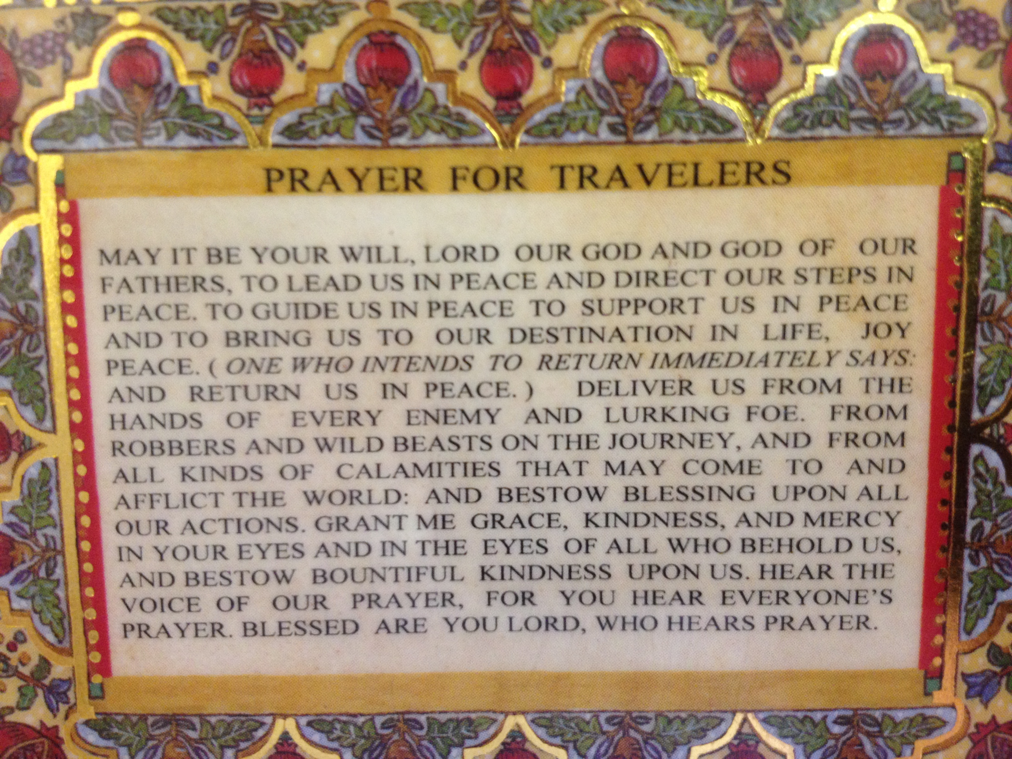 Usually, when I fly, I carry with me a small laminated card with the ancient Hebrew prayer for traveling, tefilat ha-derech. After I’m settled in my seat, as the plane begins to taxi toward the runway, I fish it out of my purse and whisper May it be your will, Lord our God, God of our fathers, to lead us in peace…to bring us to our destination in life…Deliver us from the hands of every enemy and lurking foe, from robbers and wild beasts on the journey, and from all kinds of calamities that may come…grant me grace, kindness and mercy in your eyes…blessed are you Lord who hears prayers. On this trip, I forgot the card at home. It worried me, in passing.